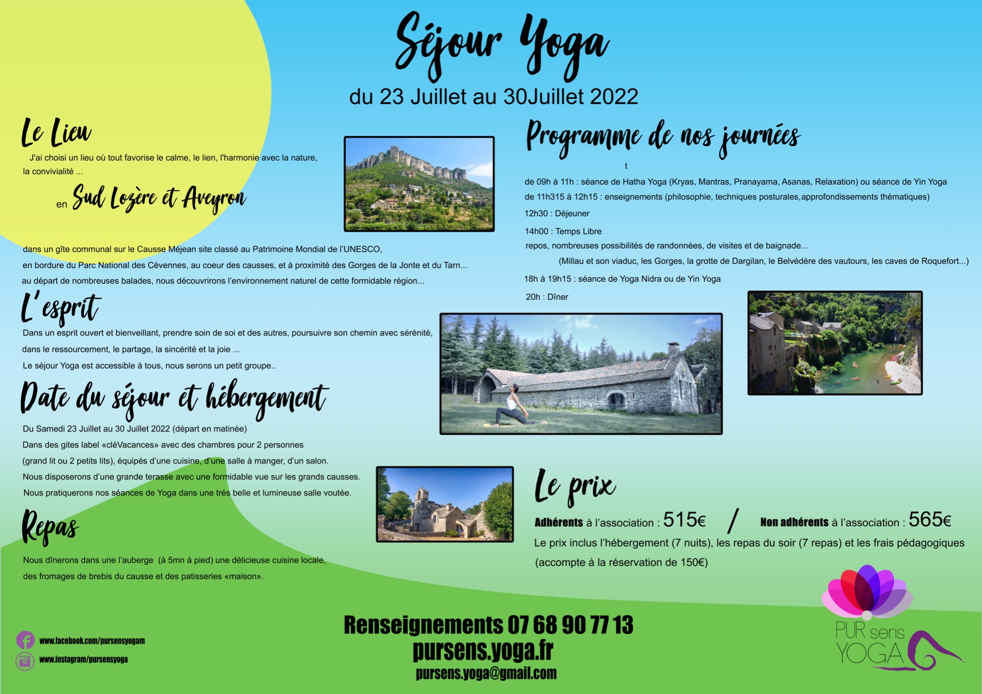 Séjour Yoga cet été du 23 juillet au 30 juillet dans la région Sud Lozère - Aveyron.COMPLET Pour toutes informations complémentaires n'hésitez pas à nous contacter. COMPLET